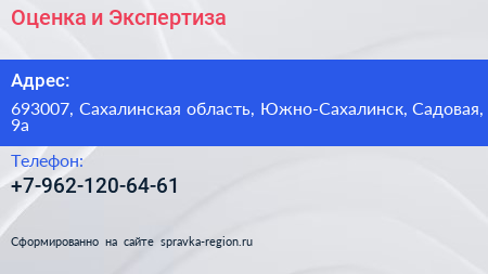 Оценка и Экспертиза по адресу 693007, Сахалинская область, Южно-Сахалинск, Садовая, 9а в дальнейшем Организация, размещена в следующих категориях: