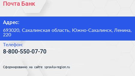 Почта Банк по адресу 693020, Сахалинская область, Южно-Сахалинск, Ленина, 220 в дальнейшем Организация, размещена в следующих категориях: