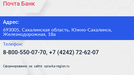 Почта Банк по адресу 693005, Сахалинская область, Южно-Сахалинск, Железнодорожная, 18а в дальнейшем Организация, размещена в следующих категориях: