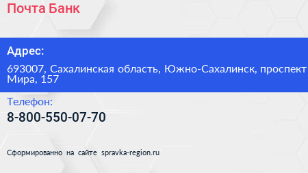 Почта Банк по адресу 693007, Сахалинская область, Южно-Сахалинск, проспект Мира, 157 в дальнейшем Организация, размещена в следующих категориях: