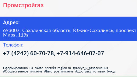 Промстройгаз по адресу 693007, Сахалинская область, Южно-Сахалинск, проспект Мира, 119а в дальнейшем Организация, размещена в следующих категориях: