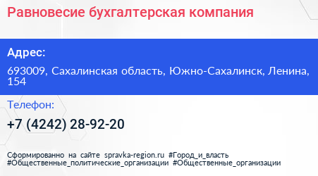 Равновесие, бухгалтерская компания по адресу 693009, Сахалинская область, Южно-Сахалинск, Ленина, 154 в дальнейшем Организация, размещена в следующих категориях: