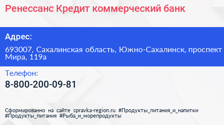 Ренессанс Кредит, коммерческий банк по адресу 693007, Сахалинская область, Южно-Сахалинск, проспект Мира, 119а в дальнейшем Организация, размещена в следующих категориях: