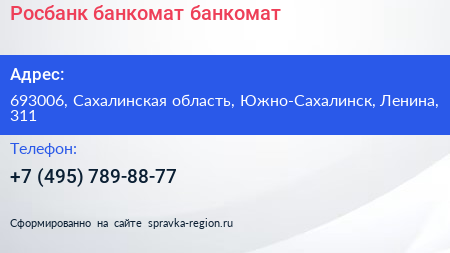 Росбанк, банкомат, банкомат по адресу 693006, Сахалинская область, Южно-Сахалинск, Ленина, 311 в дальнейшем Организация, размещена в следующих категориях: