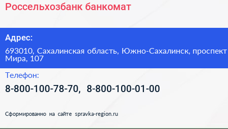 Россельхозбанк, банкомат по адресу 693010, Сахалинская область, Южно-Сахалинск, проспект Мира, 107 в дальнейшем Организация, размещена в следующих категориях: