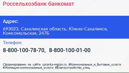 Россельхозбанк, банкомат по адресу 693023, Сахалинская область, Южно-Сахалинск, Комсомольская, 247Б в дальнейшем Организация, размещена в следующих категориях: