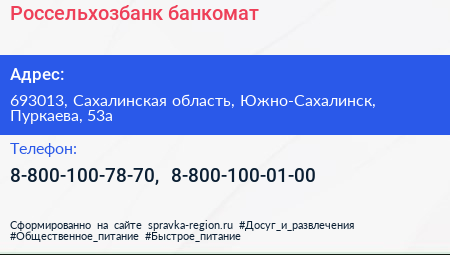 Россельхозбанк, банкомат по адресу 693013, Сахалинская область, Южно-Сахалинск, Пуркаева, 53а в дальнейшем Организация, размещена в следующих категориях: