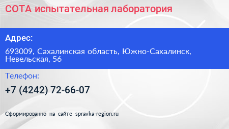 СОТА, испытательная лаборатория по адресу 693009, Сахалинская область, Южно-Сахалинск, Невельская, 56 в дальнейшем Организация, размещена в следующих категориях: