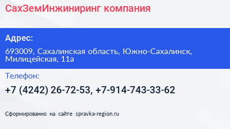СахЗемИнжиниринг, компания по адресу 693009, Сахалинская область, Южно-Сахалинск, Милицейская, 11а в дальнейшем Организация, размещена в следующих категориях: