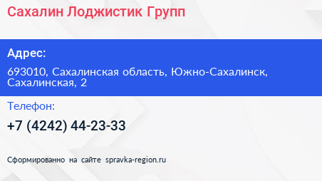 Сахалин Лоджистик Групп по адресу 693010, Сахалинская область, Южно-Сахалинск, Сахалинская, 2 в дальнейшем Организация, размещена в следующих категориях: