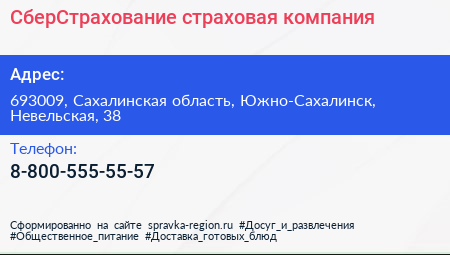 СберСтрахование, страховая компания по адресу 693009, Сахалинская область, Южно-Сахалинск, Невельская, 38 в дальнейшем Организация, размещена в следующих категориях: