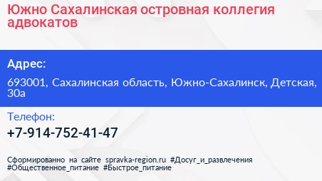 Южно-Сахалинская островная коллегия адвокатов по адресу 693001, Сахалинская область, Южно-Сахалинск, Детская, 30а в дальнейшем Организация, размещена в следующих категориях: