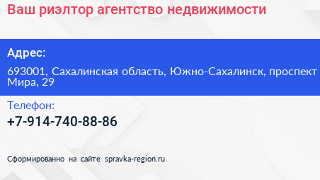 Ваш риэлтор, агентство недвижимости по адресу 693001, Сахалинская область, Южно-Сахалинск, проспект Мира, 29 в дальнейшем Организация, размещена в следующих категориях: