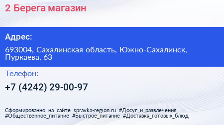2 Берега, магазин по адресу 693004, Сахалинская область, Южно-Сахалинск, Пуркаева, 63 в дальнейшем Организация, размещена в следующих категориях: