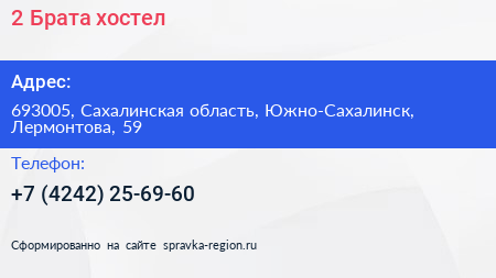 2 Брата, хостел по адресу 693005, Сахалинская область, Южно-Сахалинск, Лермонтова, 59 в дальнейшем Организация, размещена в следующих категориях: