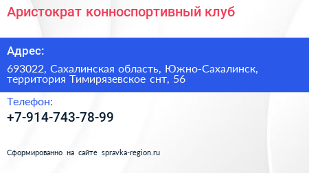 Аристократ, конноспортивный клуб по адресу 693022, Сахалинская область, Южно-Сахалинск, территория Тимирязевское снт, 56 в дальнейшем Организация, размещена в следующих категориях: