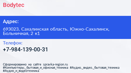 Bodytec по адресу 693023, Сахалинская область, Южно-Сахалинск, Больничная, 2 к1 в дальнейшем Организация, размещена в следующих категориях: