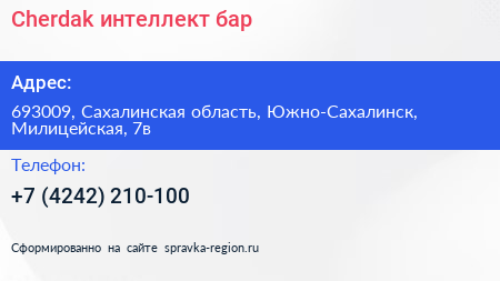 Cherdak, интеллект-бар по адресу 693009, Сахалинская область, Южно-Сахалинск, Милицейская, 7в в дальнейшем Организация, размещена в следующих категориях:
