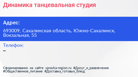 Динамика, танцевальная студия по адресу 693009, Сахалинская область, Южно-Сахалинск, Вокзальная, 55 в дальнейшем Организация, размещена в следующих категориях: