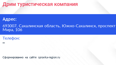 Дрим, туристическая компания по адресу 693007, Сахалинская область, Южно-Сахалинск, проспект Мира, 106 в дальнейшем Организация, размещена в следующих категориях: