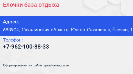 Ёлочки, база отдыха по адресу 693904, Сахалинская область, Южно-Сахалинск, Ёлочки, 1 в дальнейшем Организация, размещена в следующих категориях: