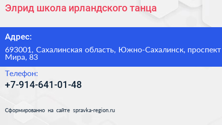 Элрид, школа ирландского танца по адресу 693001, Сахалинская область, Южно-Сахалинск, проспект Мира, 83 в дальнейшем Организация, размещена в следующих категориях: