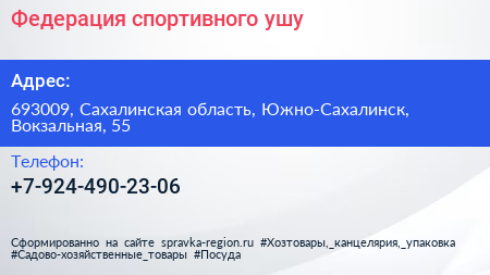 Федерация спортивного ушу по адресу 693009, Сахалинская область, Южно-Сахалинск, Вокзальная, 55 в дальнейшем Организация, размещена в следующих категориях: