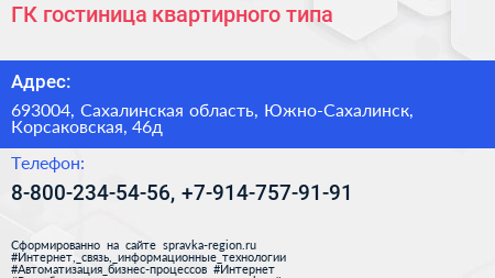 ГК, гостиница квартирного типа по адресу 693004, Сахалинская область, Южно-Сахалинск, Корсаковская, 46д в дальнейшем Организация, размещена в следующих категориях: