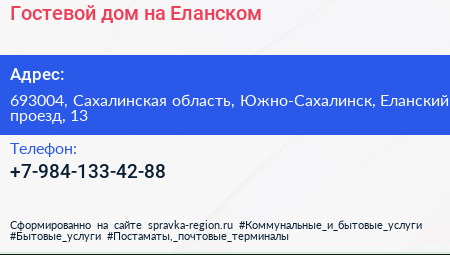 Гостевой дом на Еланском по адресу 693004, Сахалинская область, Южно-Сахалинск, Еланский проезд, 13 в дальнейшем Организация, размещена в следующих категориях: