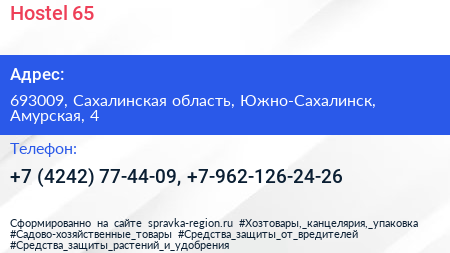 Hostel 65 по адресу 693009, Сахалинская область, Южно-Сахалинск, Амурская, 4 в дальнейшем Организация, размещена в следующих категориях: