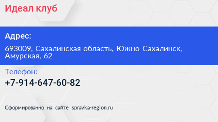 Идеал, клуб по адресу 693009, Сахалинская область, Южно-Сахалинск, Амурская, 62 в дальнейшем Организация, размещена в следующих категориях: