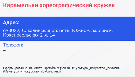 Карамельки, хореографический кружек по адресу 693022, Сахалинская область, Южно-Сахалинск, Красносельская 2-я, 14 в дальнейшем Организация, размещена в следующих категориях: