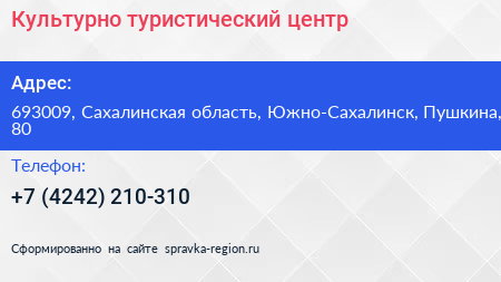 Культурно-туристический центр по адресу 693009, Сахалинская область, Южно-Сахалинск, Пушкина, 80 в дальнейшем Организация, размещена в следующих категориях: