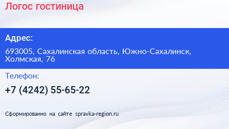 Логос, гостиница по адресу 693005, Сахалинская область, Южно-Сахалинск, Холмская, 76 в дальнейшем Организация, размещена в следующих категориях: