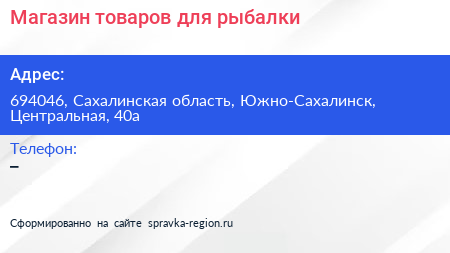Магазин товаров для рыбалки по адресу 694046, Сахалинская область, Южно-Сахалинск, Центральная, 40а в дальнейшем Организация, размещена в следующих категориях: