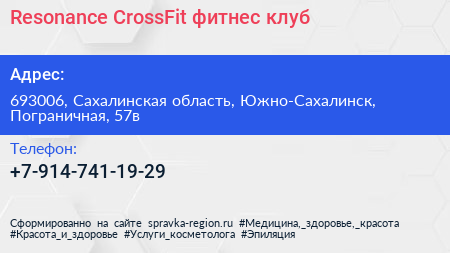 Resonance CrossFit, фитнес-клуб по адресу 693006, Сахалинская область, Южно-Сахалинск, Пограничная, 57в в дальнейшем Организация, размещена в следующих категориях:
