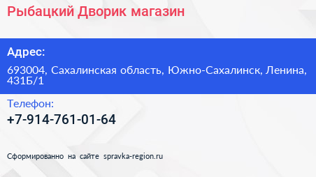 Рыбацкий Дворик, магазин по адресу 693004, Сахалинская область, Южно-Сахалинск, Ленина, 431Б/1 в дальнейшем Организация, размещена в следующих категориях: