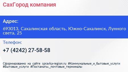 СахГород, компания по адресу 693013, Сахалинская область, Южно-Сахалинск, Лунного света, 25 в дальнейшем Организация, размещена в следующих категориях: