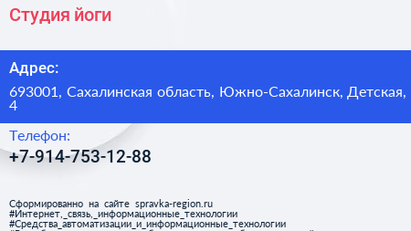 Студия йоги по адресу 693001, Сахалинская область, Южно-Сахалинск, Детская, 4 в дальнейшем Организация, размещена в следующих категориях: