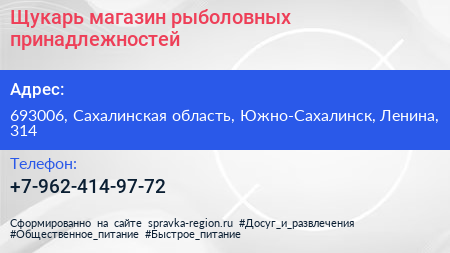Щукарь, магазин рыболовных принадлежностей по адресу 693006, Сахалинская область, Южно-Сахалинск, Ленина, 314 в дальнейшем Организация, размещена в следующих категориях:
