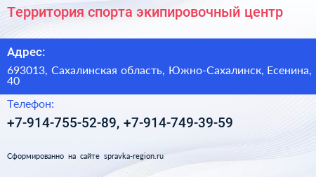 Территория спорта, экипировочный центр по адресу 693013, Сахалинская область, Южно-Сахалинск, Есенина, 40 в дальнейшем Организация, размещена в следующих категориях: