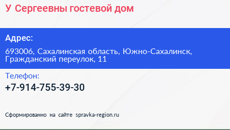 У Сергеевны, гостевой дом по адресу 693006, Сахалинская область, Южно-Сахалинск, Гражданский переулок, 11 в дальнейшем Организация, размещена в следующих категориях: