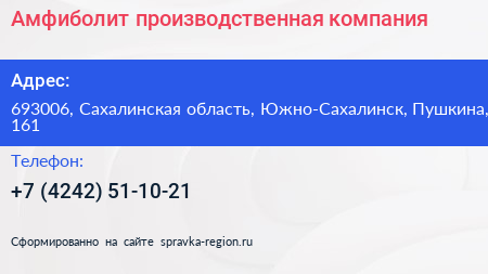 Амфиболит, производственная компания по адресу 693006, Сахалинская область, Южно-Сахалинск, Пушкина, 161 в дальнейшем Организация, размещена в следующих категориях: