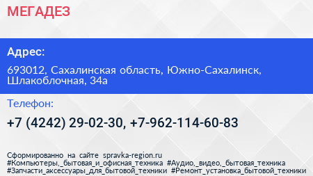 МЕГАДЕЗ по адресу 693012, Сахалинская область, Южно-Сахалинск, Шлакоблочная, 34а в дальнейшем Организация, размещена в следующих категориях: