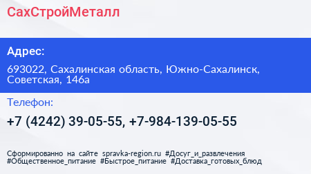 СахСтройМеталл по адресу 693022, Сахалинская область, Южно-Сахалинск, Советская, 146а в дальнейшем Организация, размещена в следующих категориях: