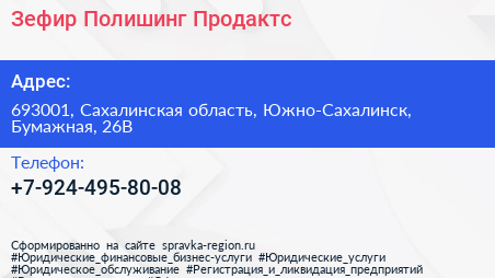 Зефир Полишинг Продактс по адресу 693001, Сахалинская область, Южно-Сахалинск, Бумажная, 26В в дальнейшем Организация, размещена в следующих категориях: