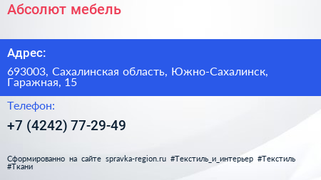 Абсолют мебель по адресу 693003, Сахалинская область, Южно-Сахалинск, Гаражная, 15 в дальнейшем Организация, размещена в следующих категориях:
