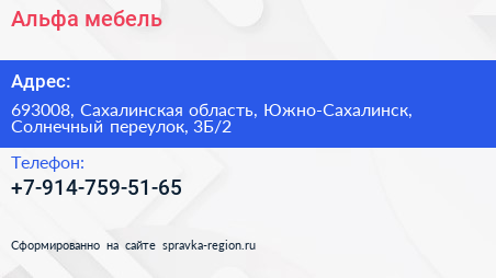 Альфа-мебель по адресу 693008, Сахалинская область, Южно-Сахалинск, Солнечный переулок, 3Б/2 в дальнейшем Организация, размещена в следующих категориях: