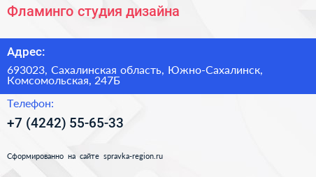 Фламинго, студия дизайна по адресу 693023, Сахалинская область, Южно-Сахалинск, Комсомольская, 247Б в дальнейшем Организация, размещена в следующих категориях: