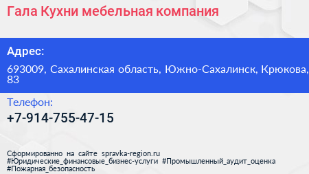 Гала-Кухни, мебельная компания по адресу 693009, Сахалинская область, Южно-Сахалинск, Крюкова, 83 в дальнейшем Организация, размещена в следующих категориях: